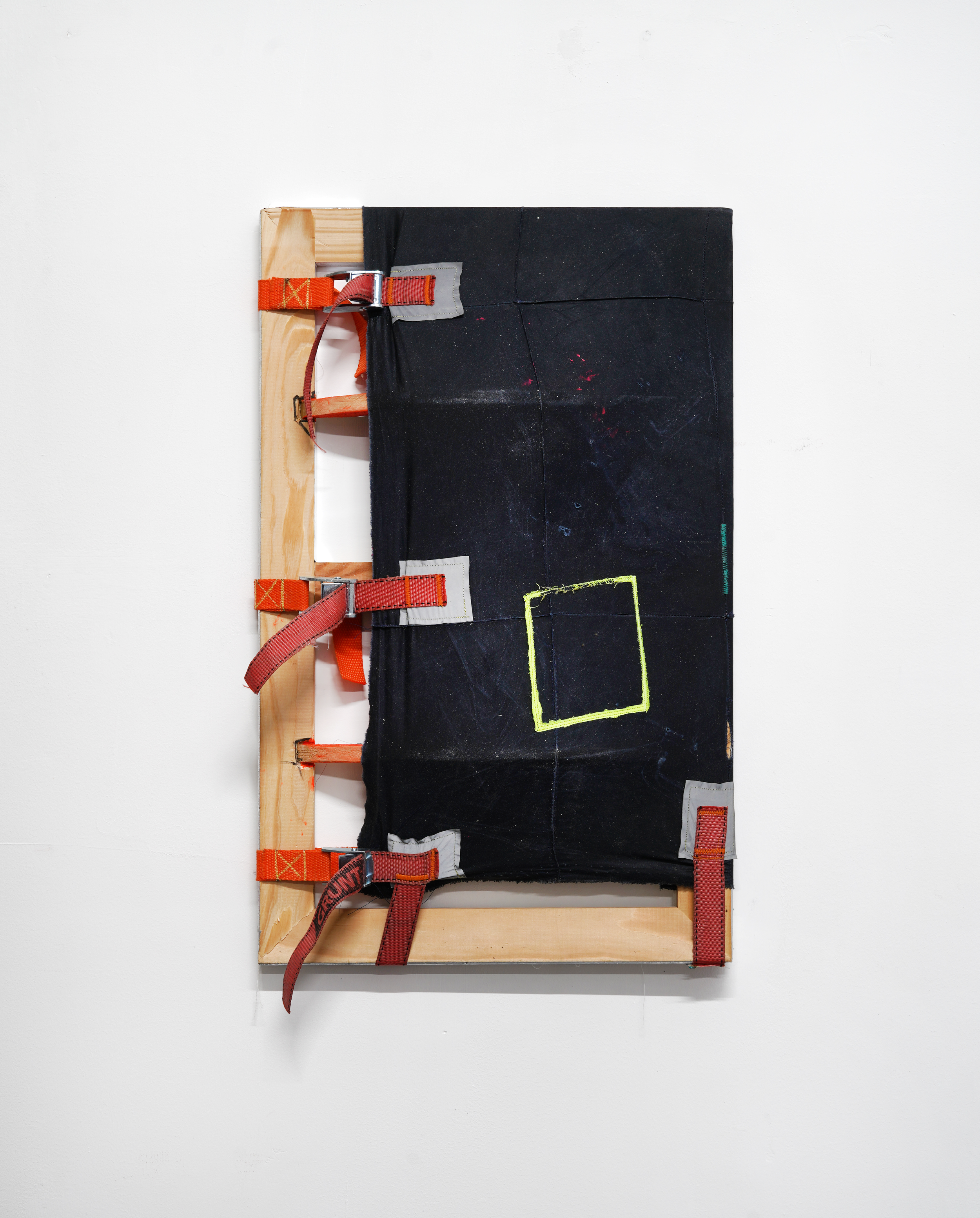 Hand and Machine Sewn Fabric, Reflective Fabric, Found Strapping, Aluminium Tape and Ratchet Straps,