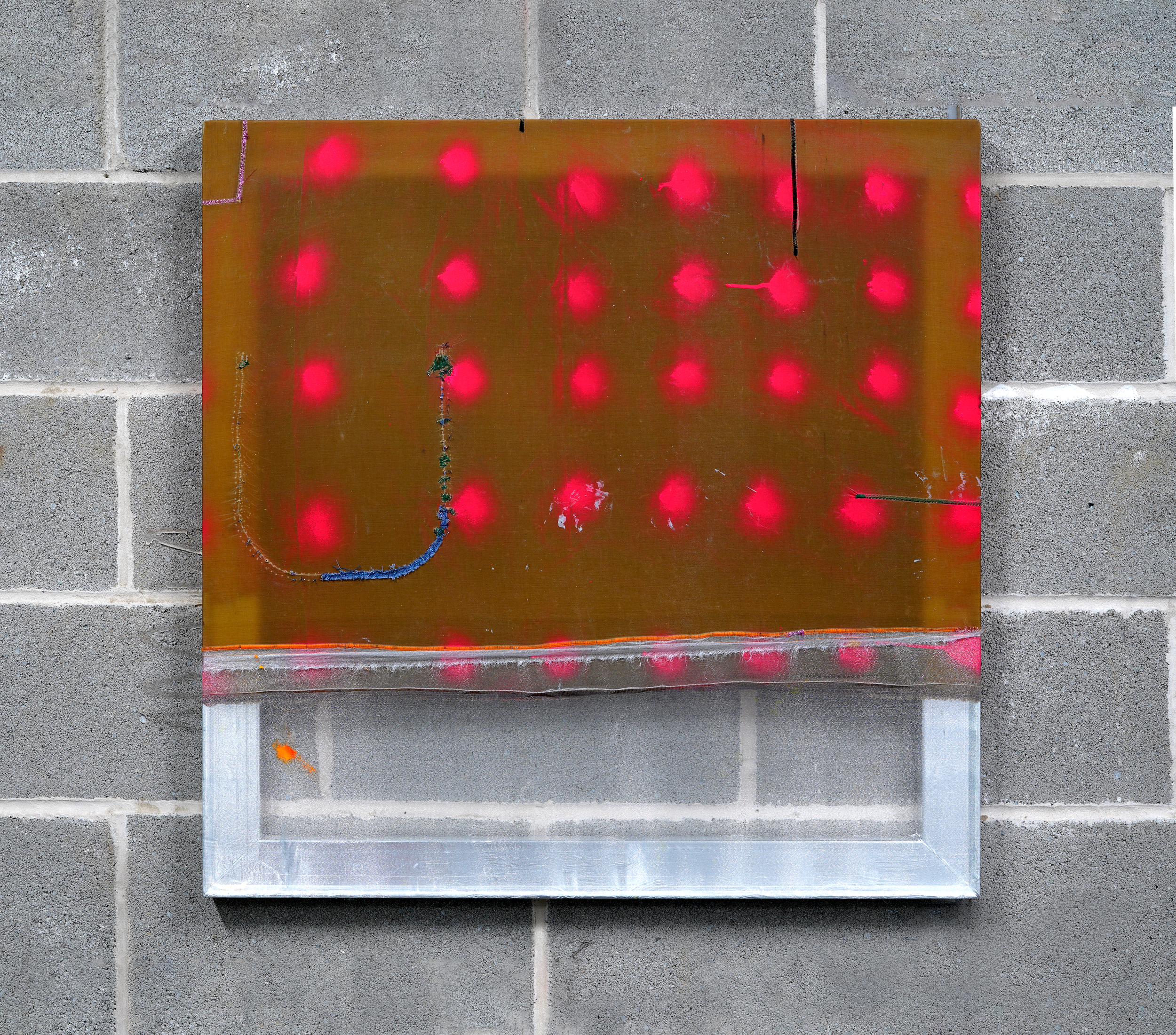 Spray Paint, Vinyl, Machine and Hand Sewn Fabric and Aluminium Tape on Stretcher,